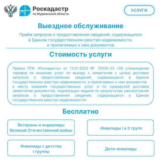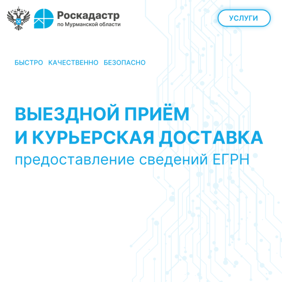 Роскадастр по Мурманской области предлагает выездной прием запросов на предоставление сведений из Единого государственного реестра недвижимости (ЕГРН), а также доставку готовых документов курьером.
