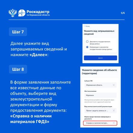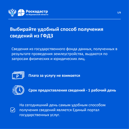 Дополнительную информацию о порядке предоставления услуги можно уточнить у специалистов филиала ППК «Роскадастр» по Мурманской области по телефону: 8 (8152) 40-30-00, 40-30-17, доб. 2507, 2508, 2395, и по электронной почте: filial@51.kadastr.ru.